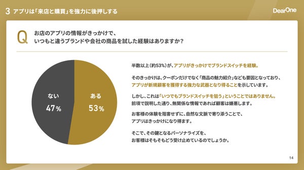 - 過半数のユーザー(約53%)がアプリの情報をきっかけに「ブランドスイッチ」を経験しているとのことです。クーポンだけでなく「商品の魅力紹介」などの情報も新規購入を後押ししています。