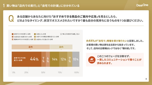 - 買い物は「自宅での計画」と「店内での実行」に分かれており、情報を受け取りたいタイミングは「自宅」が約44%で最も多くなっています。