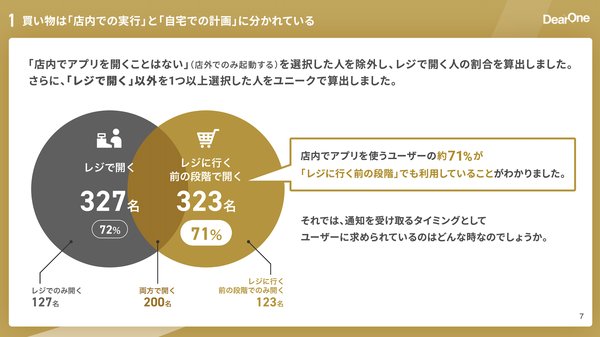 - 店内でアプリを開くユーザーの約71%が、購買の意思決定が行われる「レジ前の店内」でもアプリを活用しているとのことです。