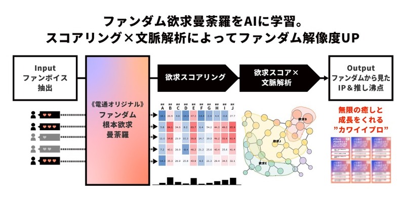 電通が独自開発したファンダム解析モデル「ファンダム欲求曼荼羅」を基に、SNSや動画配信サービスにおける公開コメントなどのデータをプライバシーに配慮してAIが解析し、ファンの"推し"に対する感情や行動の背景を素早く明らかにします。また、ファンダムの"ニン"(個性や文脈)を理解したキャスティングやコンテンツ設計を行うことで、ファンの共感が得られる施策とマーケティング戦略の立案に活用できるようになっているとのことです。