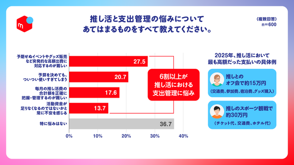 一方で、6割以上(63.3%)が推し活における支出管理に悩んでおり、特に「予期せぬイベントやグッズ販売など、突発的な高額出費に対応するのが難しい(27.5%)」が最多となっています。