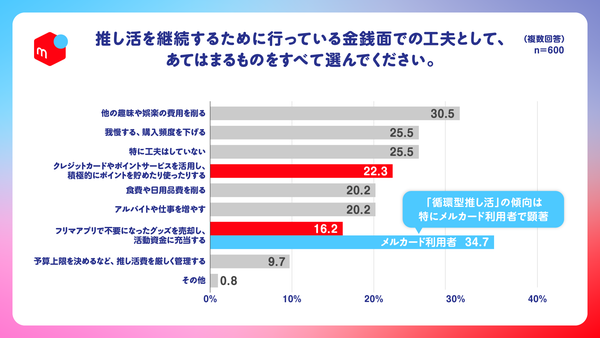 また、物価高における推し活継続の工夫としてフリマアプリを活用する人の割合は、全体(16.2%)に対して「メルカード」利用者は34.7%と約2倍に上ることが判明しました。「メルカリ」の売上金(メルペイ残高)を支払いに充当できる「メルカード」の機能が、"好き"をよりお得に楽しむ消費スタイルを後押ししているようです。