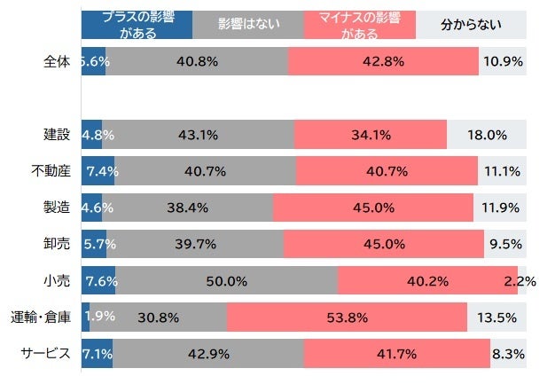 一方、「プラスの影響がある」と回答した企業の割合は、「小売」業界で21.7%に上昇し、全体平均を10ポイント以上上回る結果となったことが報告されています。