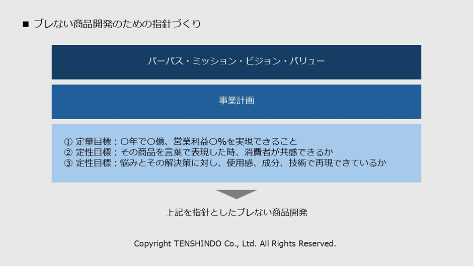 化粧品も例外ではなく、「ブレ」が発生することが往々にしてあります。それは、何を目指すべきかという指針が曖昧で、時間とともにチーム内で意見が分かれたり、あるいは積極的に発言する人の主張に引っ張られてしまい、意思統一が図れていない状況で起こってしまうのです。