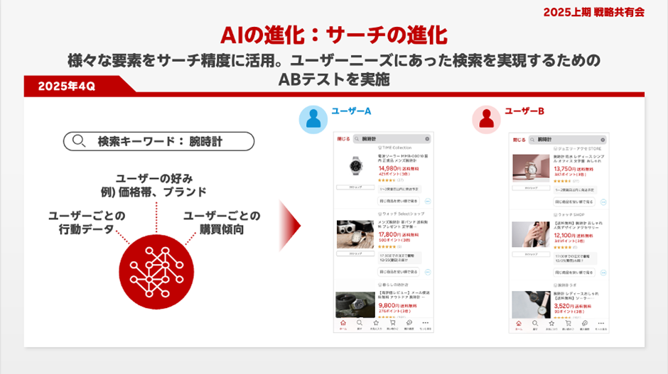 パーソナライズド検索の実装により、検索経由の流通額は一定の伸びを示しましたが、その影響はまだ限定的です。楽天は今後、LLM(大規模言語モデル)を活用した検索・提案の高度化を進めるとしています。これは、キーワード中心だった検索行動が、「目的や文脈」を含んだ形に変化することを意味します。