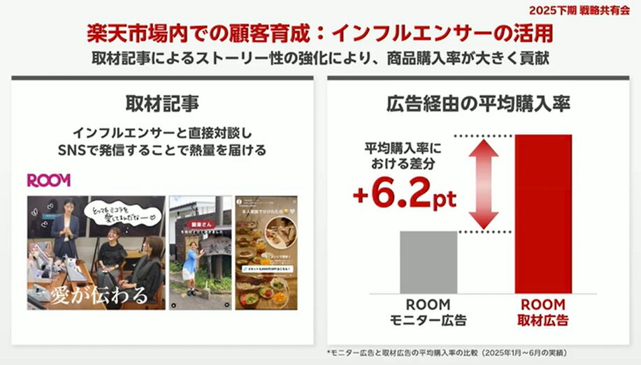 楽天市場では近年、ROOMを中心としたインフルエンサー活用が単発施策から中長期戦略へと移行しつつあります。取材型広告がモニター施策より高い購入率を示すなど、一定の成果も確認されています。一方で、費用感は高く、成果の振れ幅も大きいため「とりあえず試す」段階は終わりつつあります。2026年に向けては、商品特性やLTVを踏まえ、どのフェーズで・どの目的でインフルエンサーを使うのかを整理した上で、再現性のある運用設計が求められます。
