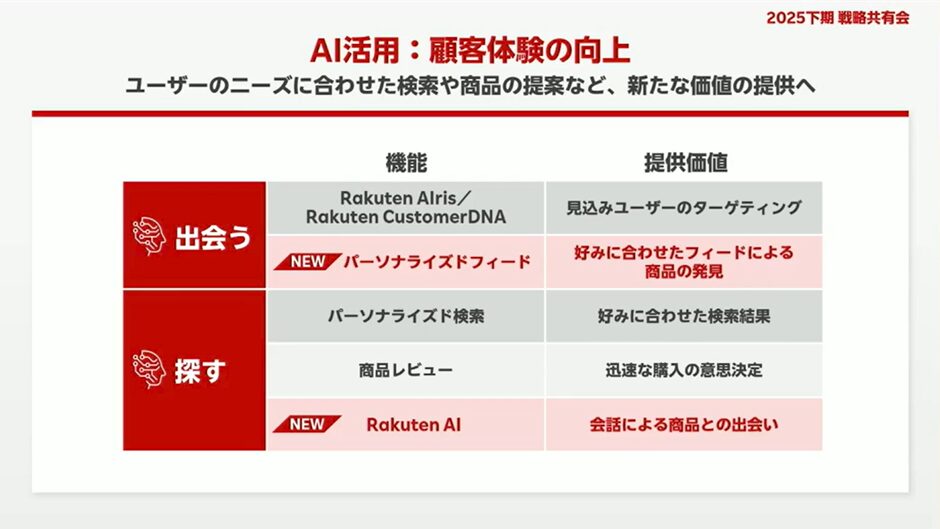 パーソナライズド検索に続き、楽天はAIによる商品提案の強化を明確に打ち出しています。今後は「ユーザーが探す」だけでなく、「AIが提案する」購買体験が拡張されていくでしょう。この環境下では、AIに選ばれる商品であるかどうかが重要になります。