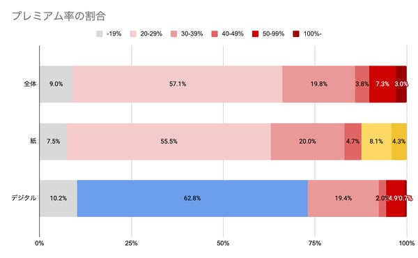 2025年に発行されたプレミアム商品券の平均プレミアム率は29%ですが、紙とデジタルでは割引率の分布が異なることがわかりました。デジタル商品券は比較的多くの人に使ってもらうことが前提にあるためか、プレミアム率20〜29%の割合が62.8%と最も高く、平均プレミアム率も24.1%でした。一方、紙の場合は50%以上の高プレミアム率の商品券を出す自治体が12.4%とデジタル(5.6%)よりも多く、平均プレミアム率も31.5%であることが明らかになっています。