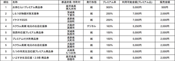 プレミアム率の高い自治体・商店街のランキングは以下の通りです。地方の自治体では、プレミアム商品券のプレミアム率を高めることで、居住者の地元定着を狙っていることがわかります。