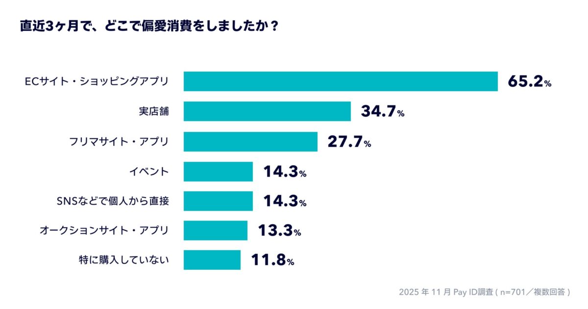 直近3ヶ月で、どこで偏愛消費をしましたかという質問に対しては、ECサイト・ショッピングアプリが65.2%、実店舗が34.7%、フリマサイト/アプリが27.7%、イベントが14.3%、SNSなどで個人から直接が14.3%、オークションサイト/アプリが13.3%、特に購入していないが11.8%という結果になりました。