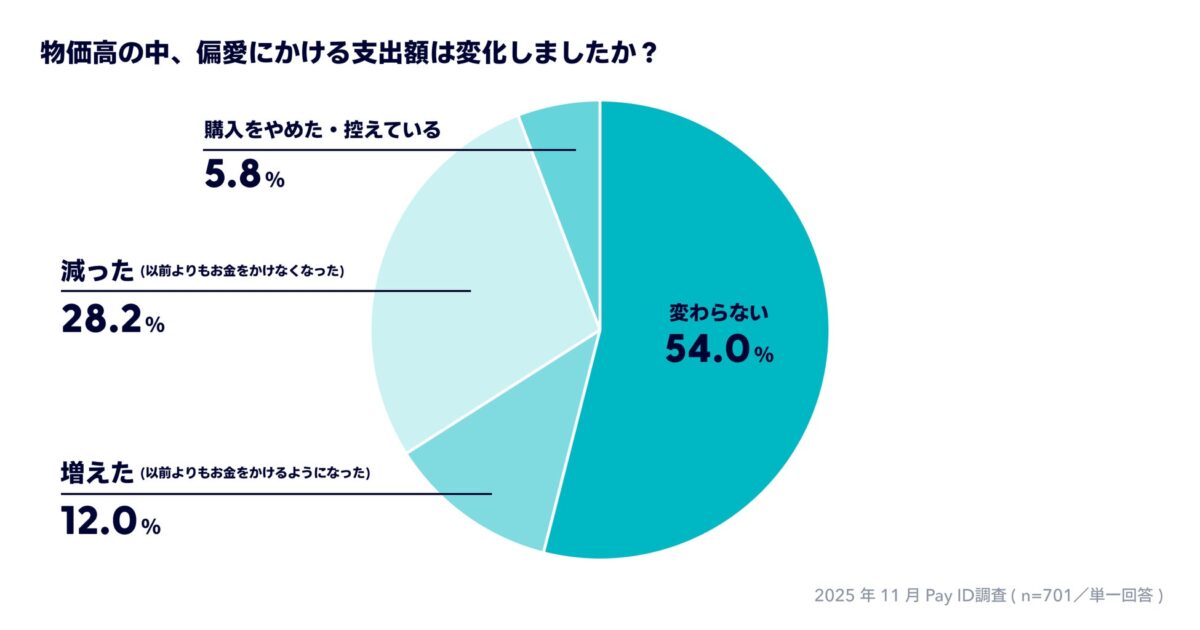 物価高の中、偏愛にかける支出額は変化しましたかという質問に対しては、変わらないが54.0%、増えた(以前よりもお金をかけるようになった)が12.0%、減った(以前よりもお金をかけなくなった)が28.2%、購入をやめた/控えているが5.8%でした。
