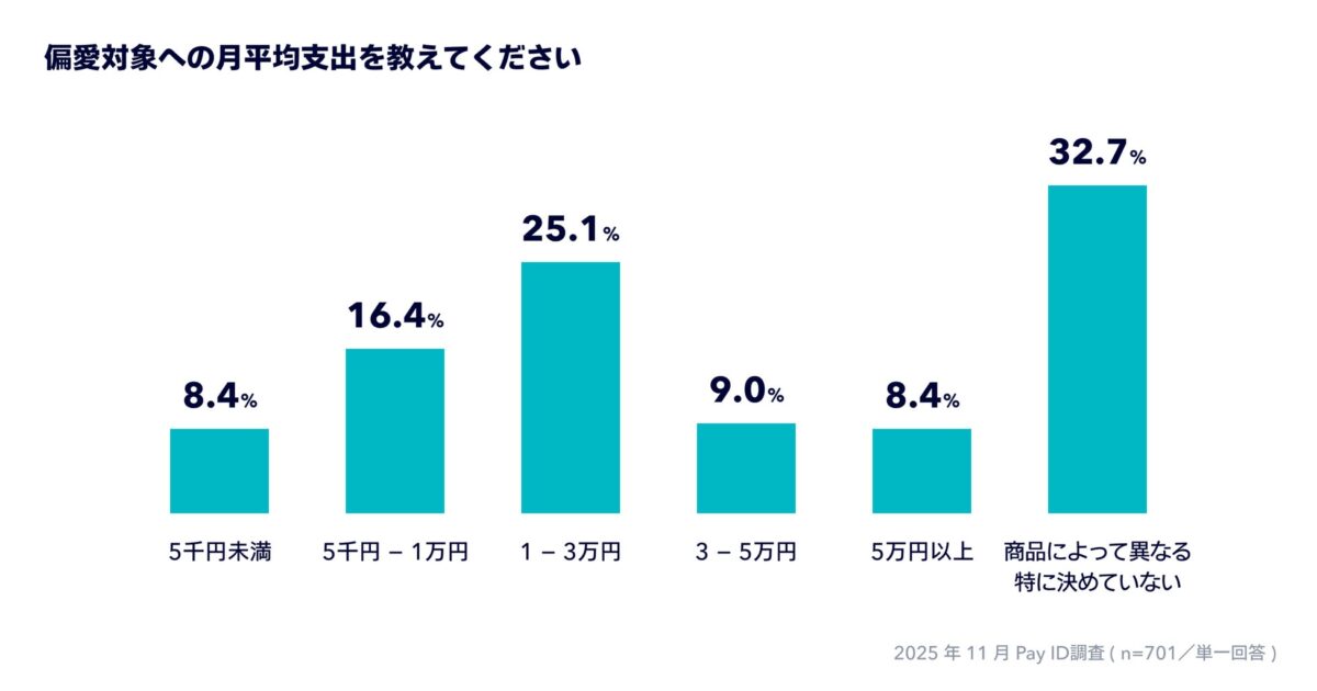偏愛消費の月平均支出については、毎月一定金額を支出している方が67.3%で、そのうち「1〜3万円」が25.1%と最多となりました。