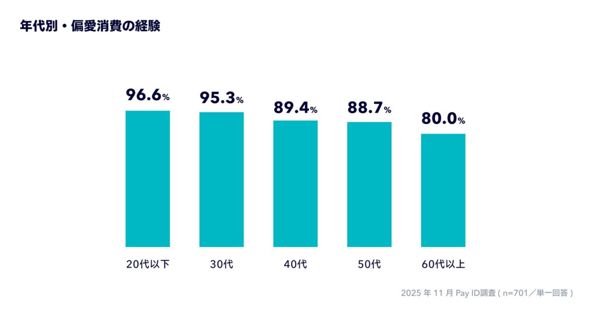 年代別に見ていくと、「20代以下」が96.6%、「30代」が95.3%と9割を超えており、「40代」が89.4%、「50代」が88.7%、「60代以上」が80.0%となっています。調査を行った全ての年代において、8割以上の方が偏愛消費を経験していることが明らかになりました。