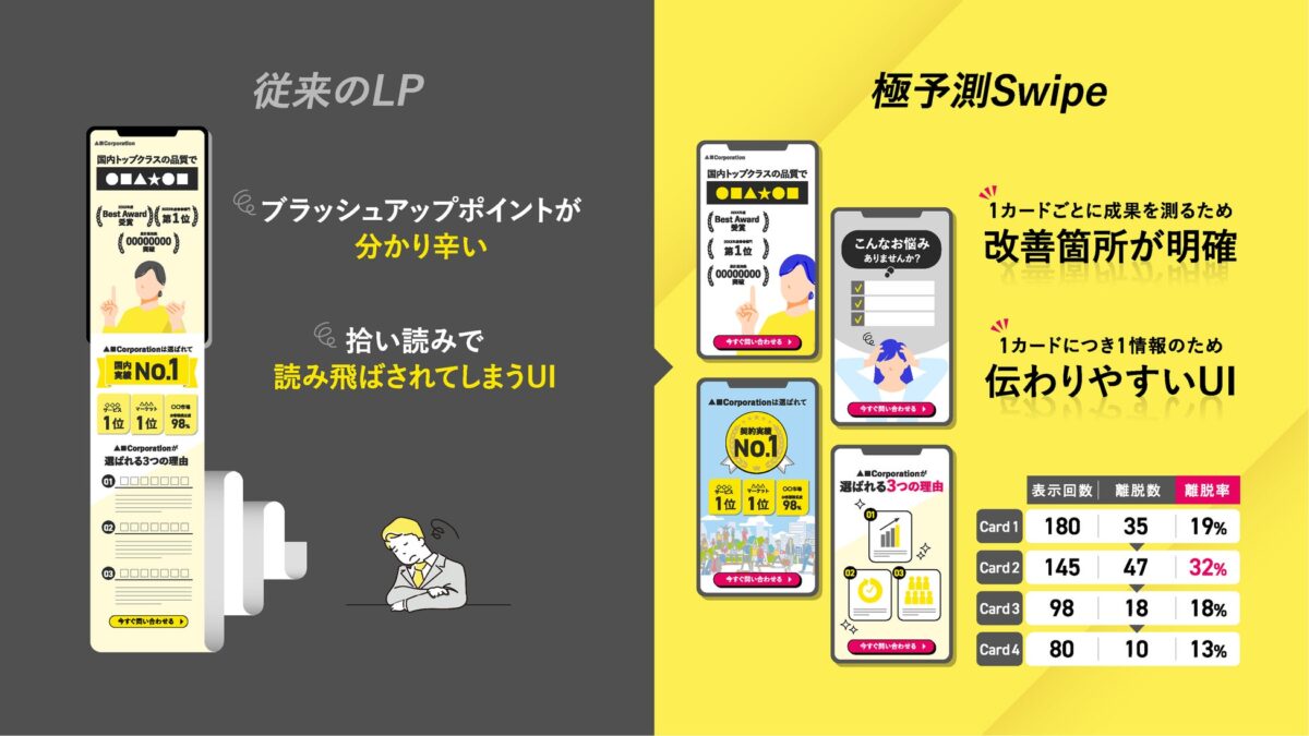 ユーザーがSNSを見るような感覚で、カード形式の画面をスワイプしながら直感的に読み進めることができるLP形式を採用しています。「1カード1メッセージ」という構成により、情報の読み飛ばしを防止し、訴求内容を確実にユーザーへ届けることが可能です。さらに、離脱率の高いカードを定量的に把握できるため、明確な根拠に基づいた改善施策を実施することができます。