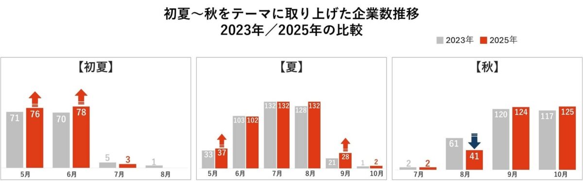 また、この夏の長さは「秋」の販促テーマにも影響を与えていることが読み取れます。2025年9月に過去最多の全国250地点以上で猛暑日を記録したことから、2023年は8月時点で「秋」を取り上げる企業数が61社だったのに対し、2025年には41社に減少しました。