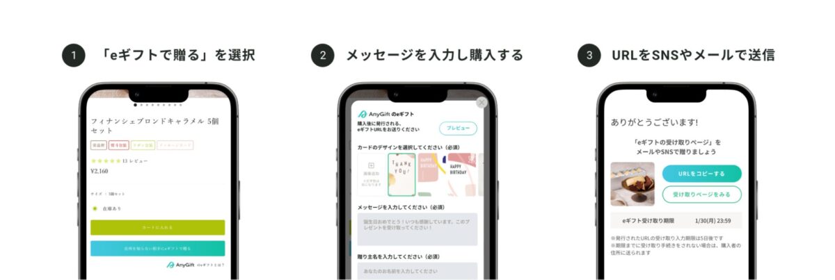 AnyGiftは、贈る相手の住所が分からない場合でも、LINEやメールを通じて贈ることが可能な「eギフト機能」をECサイトに実装できるサービスとなっています。