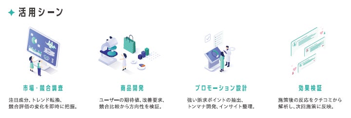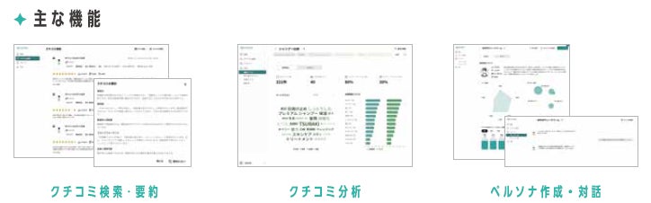 3つ目は、ペルソナ作成とインタラクティブなヒアリング機能です。膨大なクチコミデータベースから、商品のターゲットとなるペルソナを作成することができます。さらに、そのペルソナに対して「シャンプーで重視する項目は何ですか」といった質問をチャット形式でヒアリングすることも可能です。回答の根拠となったクチコミも即座に参照することができるため、より深い消費者理解が実現します。