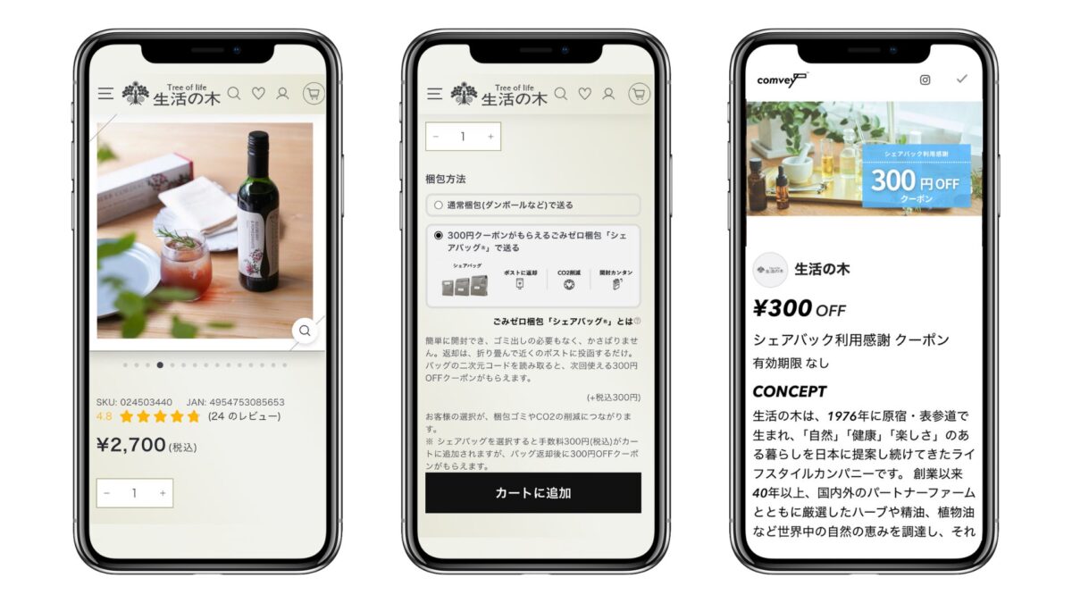株式会社comvey(コンベイ、本社:東京都中央区、代表取締役:梶田伸吾)は、株式会社生活の木(本社:東京都渋谷区、代表取締役:重永 忠)が運営する「生活の木」公式オンラインストアにおいて、郵便ポストで返却可能なリユース梱包材「シェアバッグ®︎」とそのオペレーションシステムが導入されたことを発表しました。この取り組みにより、利用者は梱包に関するストレスから解放されるとともに、配送時に発生する梱包廃棄物を最小限に抑え、段ボール回収や廃棄物焼却時のCO2排出量を85%以上削減し、脱炭素化の推進が可能になるとのことです。