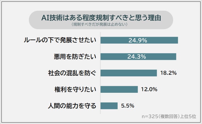 ある程度規制すべき(規制すべきだが発展は止めない)と回答した325名に理由を尋ねたところ、1位は「ルールの下で発展させたい(24.9%)」でした。僅差で2位は「悪用を防ぎたい(24.3%)」という結果になっています。