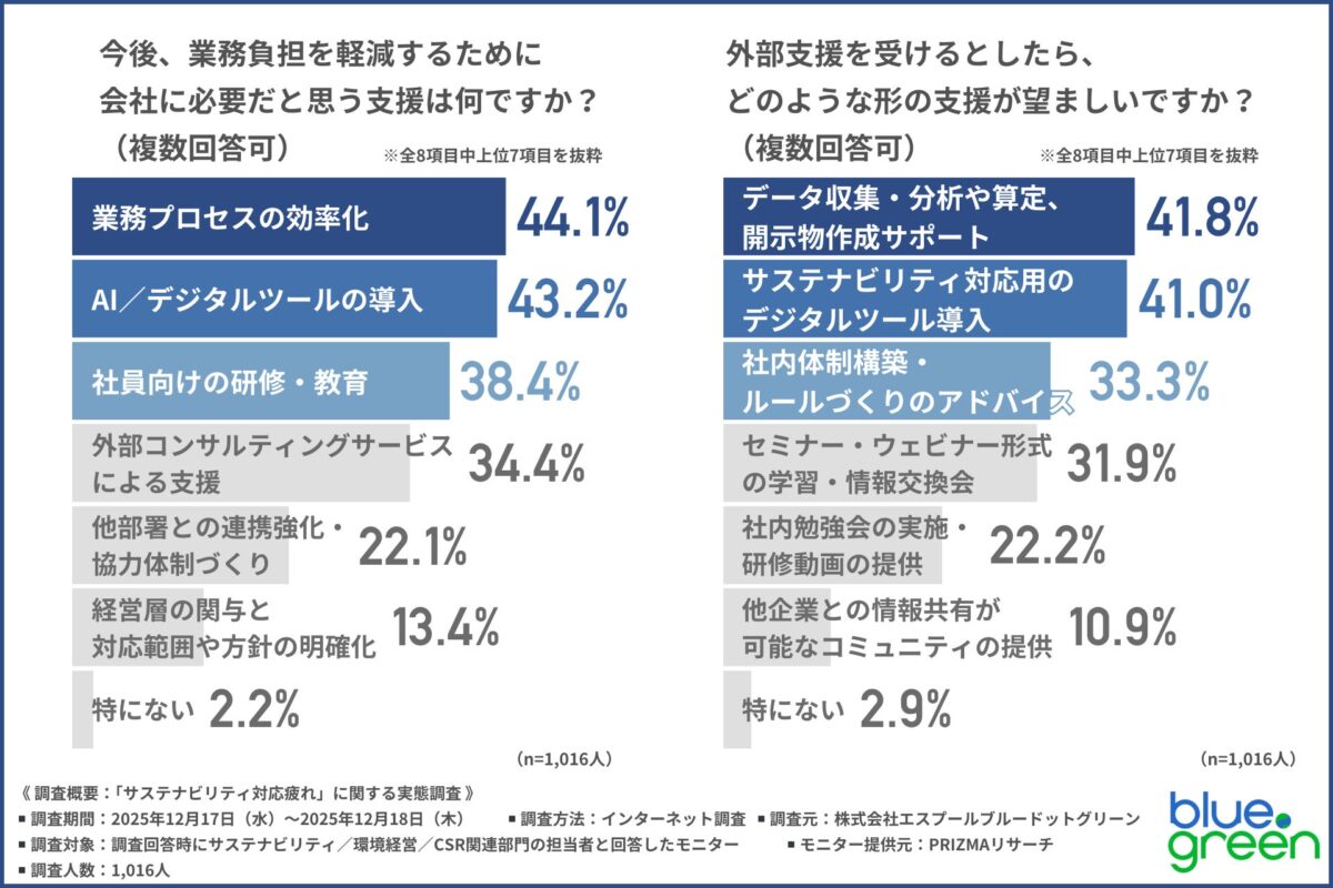 株式会社エスプールブルードットグリーン(東京都千代田区、取締役社長:八林 公平)が、サステナビリティ・環境経営・CSR関連部門の担当者を対象とした「サステナビリティ対応疲れ」の実態調査を実施しました。