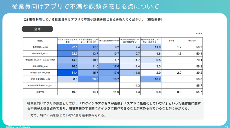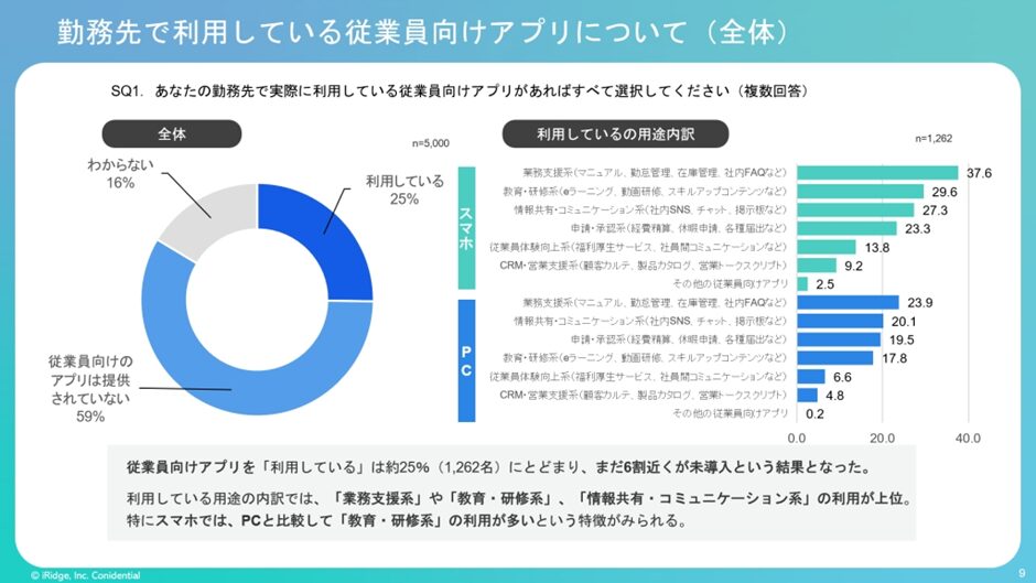 実際に従業員向けアプリを利用しているかどうかという質問への回答では、『利用している』が25%にとどまっており、この分野へのアプリ導入はまだあまり進んでいないことがわかります。