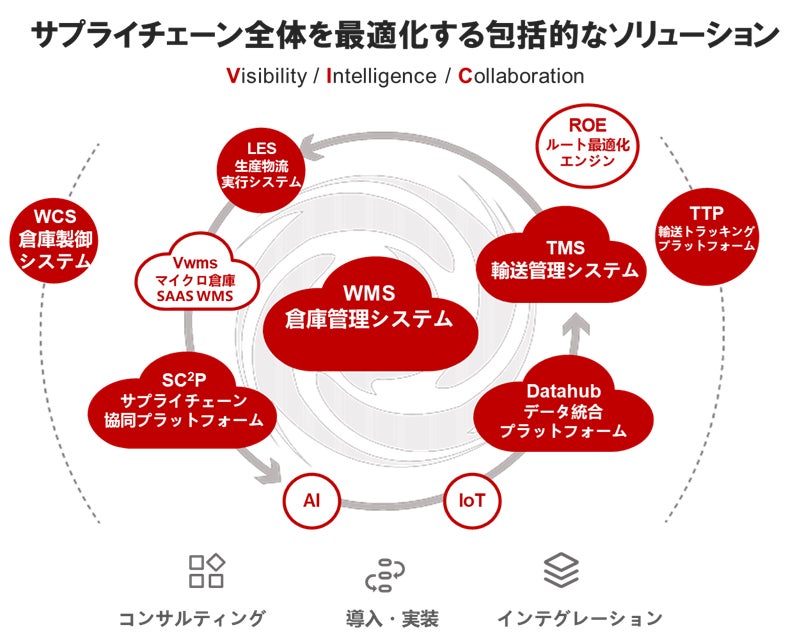 倉庫管理(WMS)を中核として、輸送管理(TMS)、倉庫制御(WCS)、生産物流実行(LES)、データ統合(Datahub)、サプライチェーン協調プラットフォームを連携させることで、物流・製造・輸送・流通を横断した業務改革とDXを実現する仕組みとなっています。