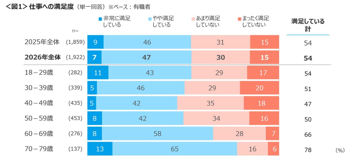 有職者を対象とした仕事への満足度調査では、「非常に満足している」と「やや満足している」を合わせた割合が54%という結果になりました。しかし、40代における満足度は47%と半数を下回っており、世代による違いが見られます。特に注目すべき点として、「まったく満足していない」と回答した割合が30代で20%と高い水準を示しています。