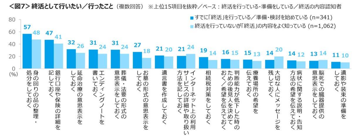 自分自身の「終活(人生の終わりを意識した事前準備)」として行いたい、または既に行ったこととしては、「身の回りの品の整理・処分をしておく」「銀行口座や保険の詳細を記しておく」「延命治療の意思表示をしておく」「エンディングノートを書いておく」「葬儀・法要の形式の意思表示をしておく」といった項目が上位に挙げられています。