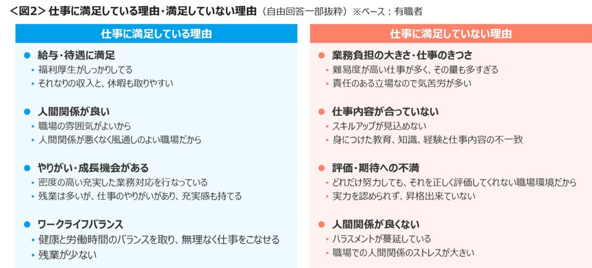 仕事に満足している理由としては、給与・待遇の良さ、良好な人間関係、やりがいや成長機会の存在などが挙げられています。一方で、仕事に満足していない理由としては、業務負担が大きい・仕事がきつい、仕事内容が自分に合っていない、評価や期待に対する不安といった要因が上位となりました。