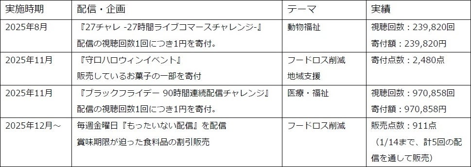 2025年はこのビジョンを具現化する年として位置づけており、ライブ配信の視聴数に連動した寄付の仕組みや、食品ロス削減を狙いとした配信企画・イベントへの協賛など、ライブコマースと社会的課題の解決を組み合わせた多様な活動を展開してきたとのことです。