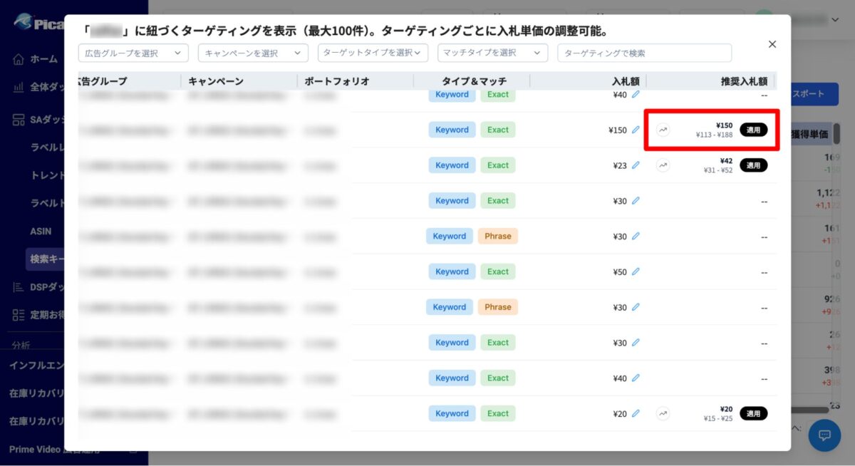 Amazonが提示する推奨入札単価について、単なる数値表示ではなく、時系列のトレンドとして可視化する機能を搭載しています。