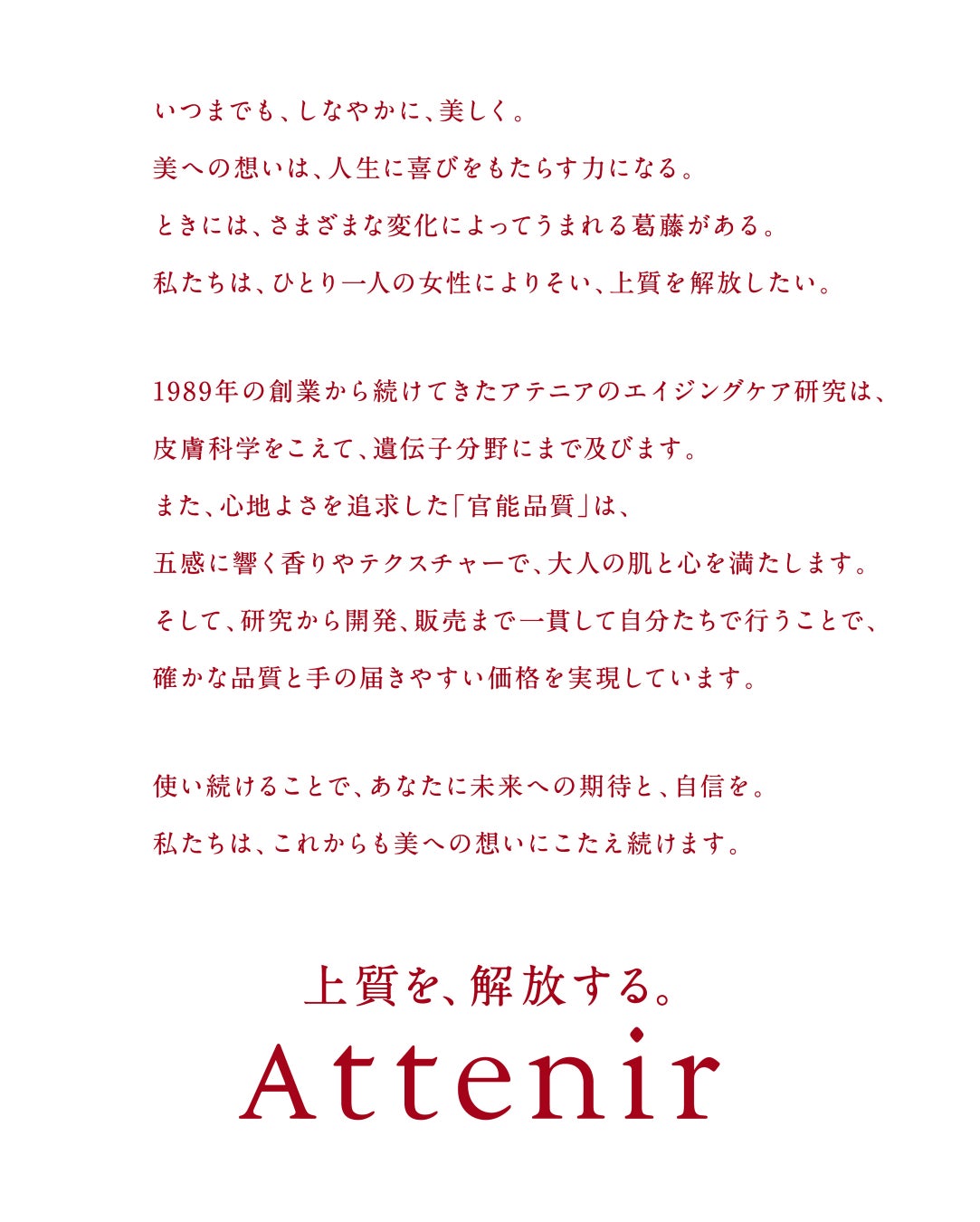 アテニアは、女性の本音に寄り添い、「品質」と「使い心地」にこだわって、確かな美しさを「続けられる価格」で提供するブランドです。1989年の創業以来継続しているエイジングケア研究から生み出される「確かな品質」と、五感に響く香りや触り心地などの「官能品質」の追求、製造から販売までを一貫して自社で実施することにより実現される「適正価格」で、大人女性の肌も心も解き放つ上質な体験を提供しています。