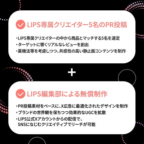 今回リリースされた広告メニューは、X広告配信において500万円以上の広告出稿を行う広告主を対象としたサービスとなっています。このメニューでは、「LIPS Production」に在籍するLIPS専属クリエイター5名によるPR投稿の制作に加え、LIPS編集部による配信用クリエイティブの制作を無償で提供するという、X社との共同企画による特別なプログラムです。