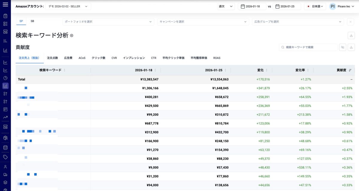 株式会社Picaro.AI(本社:横浜みなとみらい)は、Amazonベンダーおよびセラー向けに提供している分析プラットフォーム「Picaro.AI」において、検索キーワードレベルでのコントリビューション比較分析機能の提供を開始しました。この新機能によって、全体KPIの変動を検索キーワード単位で分解し、各キーワードがどの程度寄与しているかをbps(ベーシスポイント)ベースで可視化できるようになります。