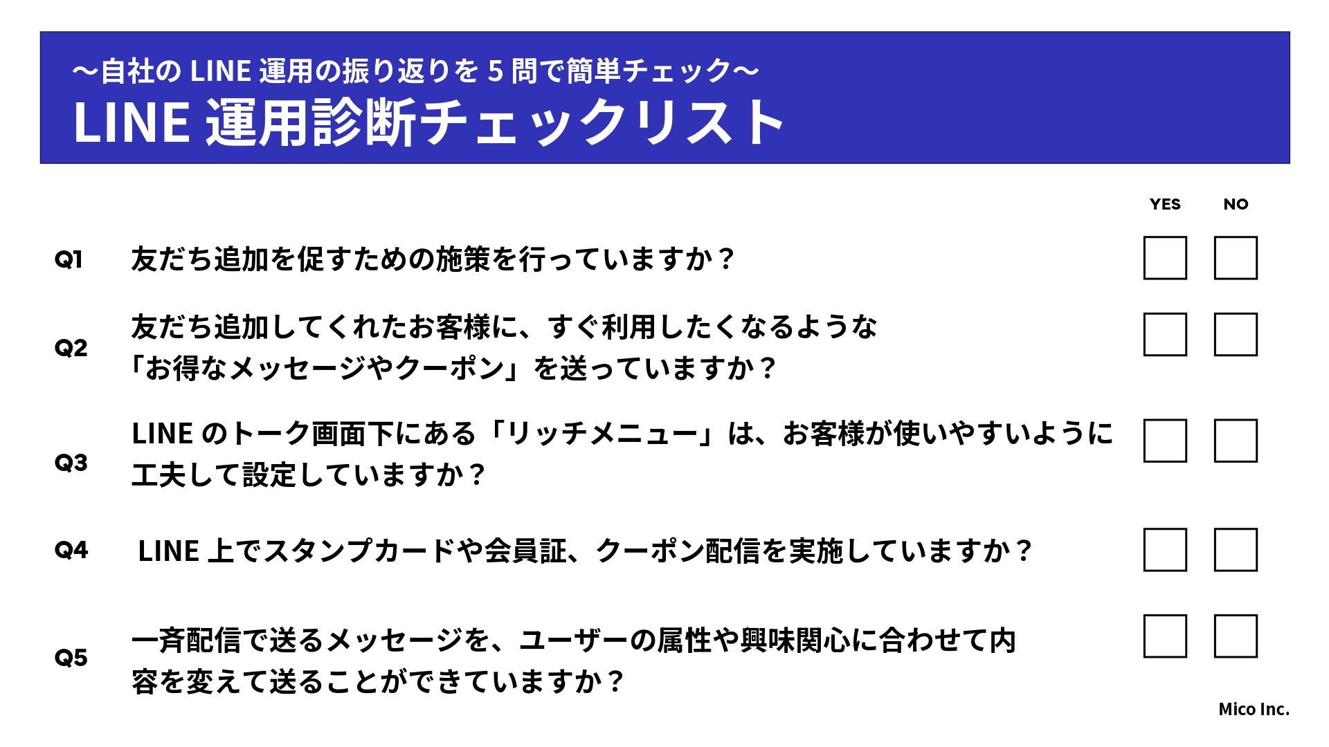 LINE運用の診断チェックリストです。以下の5つの質問に対し、自社の運用が「はい」か「いいえ」で回答してみてください。本記事で解説していきます。