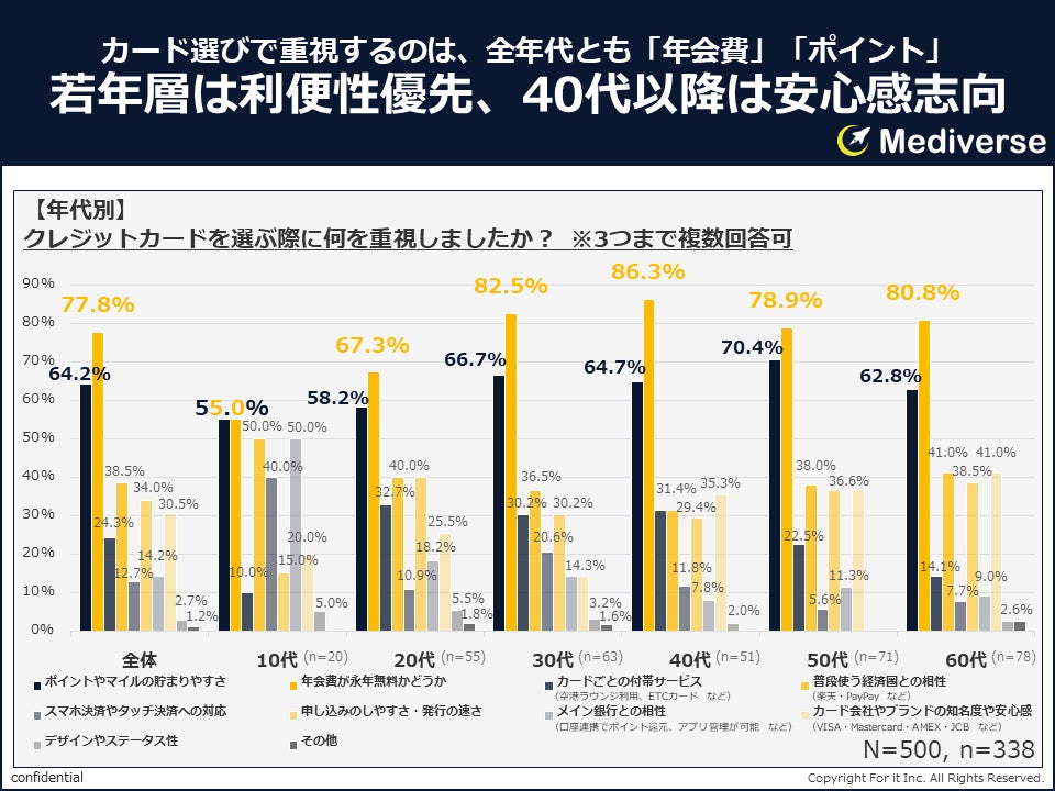 年代別では、全世代において「年会費が永年無料かどうか」と「ポイントやマイルの貯まりやすさ」が圧倒的に多く、コストパフォーマンスを意識していることがわかります。年代ごとの特徴として、10代は「普段使う経済圏との相性」や「メイン銀行との相性」が高くデジタルサービスとの親和性を、20代は「申し込みのしやすさ・発行の速さ」が高く利便性を、40代以降は「カード会社やブランドの知名度や安心感」が上昇傾向にあり信頼性をそれぞれ重視していることが推測されます。