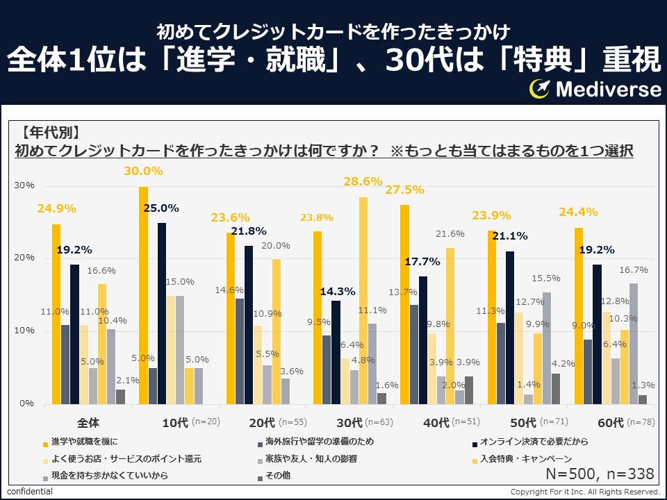 年代別では、30代を除く全年代で「進学や就職を機に」が首位となりました。30代では「入会特典・キャンペーン」(28.6%)が主流となっており、コストパフォーマンスを重視する姿勢がうかがえます。50代・60代では「現金を持ち歩かなくていいから」の比率が比較的高く、利便性や防犯性を考慮していることが推測されます。