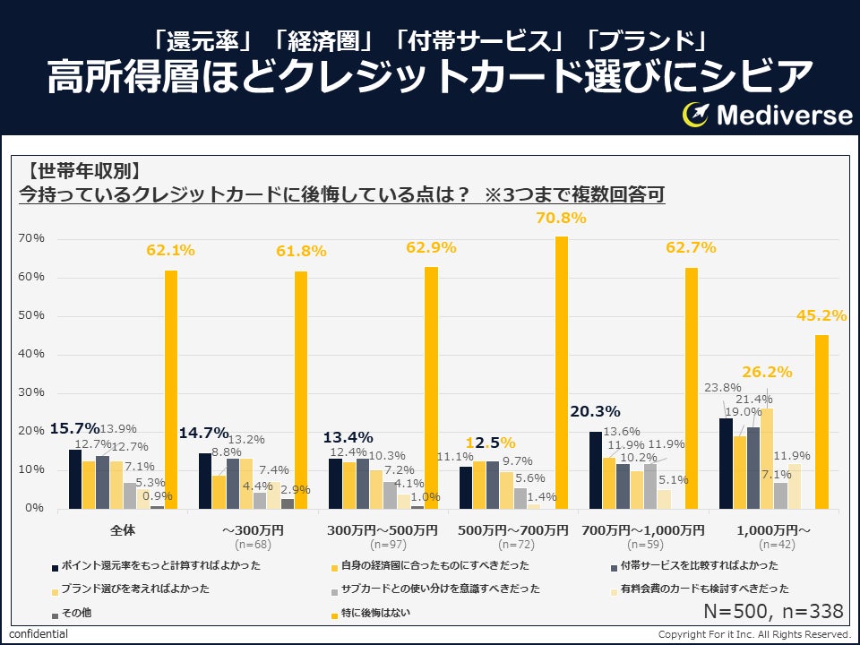 世帯年収別では、「特に後悔はない」の割合が最も高かったのは世帯年収500万円から700万円の層(70.8%)で、最も低かったのは世帯年収1,000万円以上の層(45.2%)となり、高所得層ほどカード選択に対する要求水準の高さが示唆されました。特に「ブランド選びを考えればよかった」(26.2%)、「ポイント還元率をもっと計算すればよかった」(23.8%)、「付帯サービスを比較すればよかった」(21.4%)、「自身の経済圏に合ったものにすべきだった」(19.0%)がいずれも高く、複数の観点で十分に比較できていなかった点を後悔する傾向がうかがえます。
