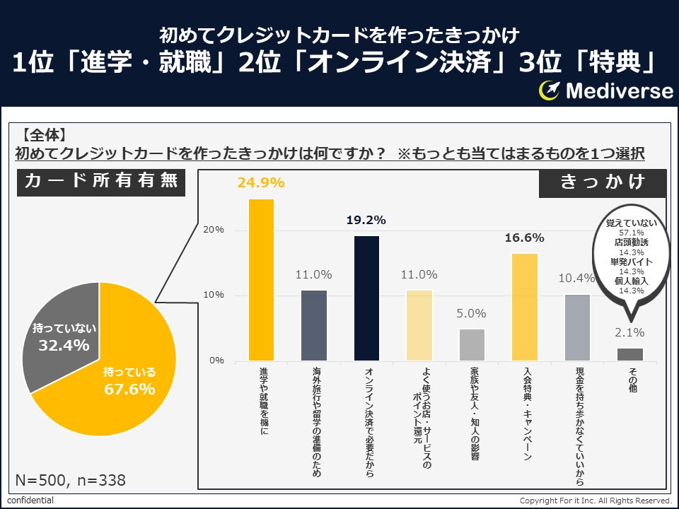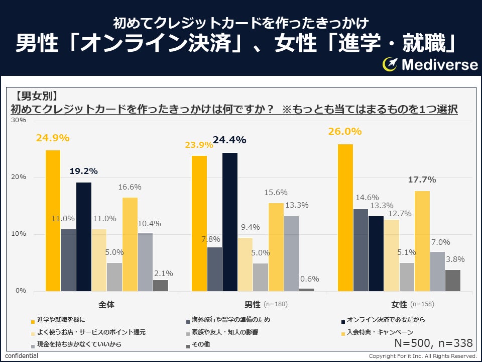男女別で分析すると、明確なジェンダー差が確認されました。男性は「オンライン決済に必要だから」(24.4%)と「進学や就職を機に」(23.9%)が僅差で上位となったのに対し、女性は「進学や就職を機に」(26.0%)が最多で、その次に「入会特典・キャンペーン」(17.7%)が続きました。また「海外旅行や留学の準備のため」という回答は女性が男性の約2倍となっており、女性の方が長期的な視点でカード作成を検討する傾向が見られます。