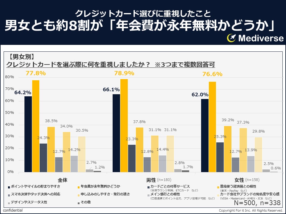 男女別に分析すると、カード選択時に重視した点に大きなジェンダー差は見られませんでした。男女とも約8割が「年会費が永年無料かどうか」、6割強が「ポイントやマイルの貯まりやすさ」を重視しています。ただし男性は「カード会社やブランドの知名度や安心感」の割合が高く信頼性を求める傾向があるのに対し、女性は「カードごとの付帯サービス」や「申し込みのしやすさ・発行の速さ」の割合が高く、利便性を優先する傾向が見られます。