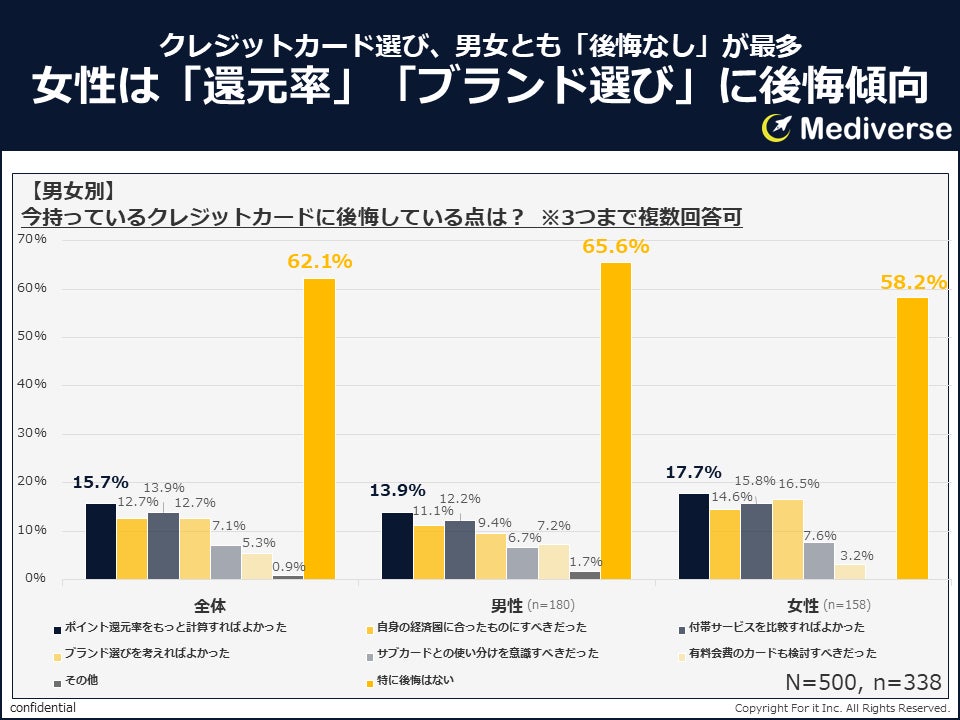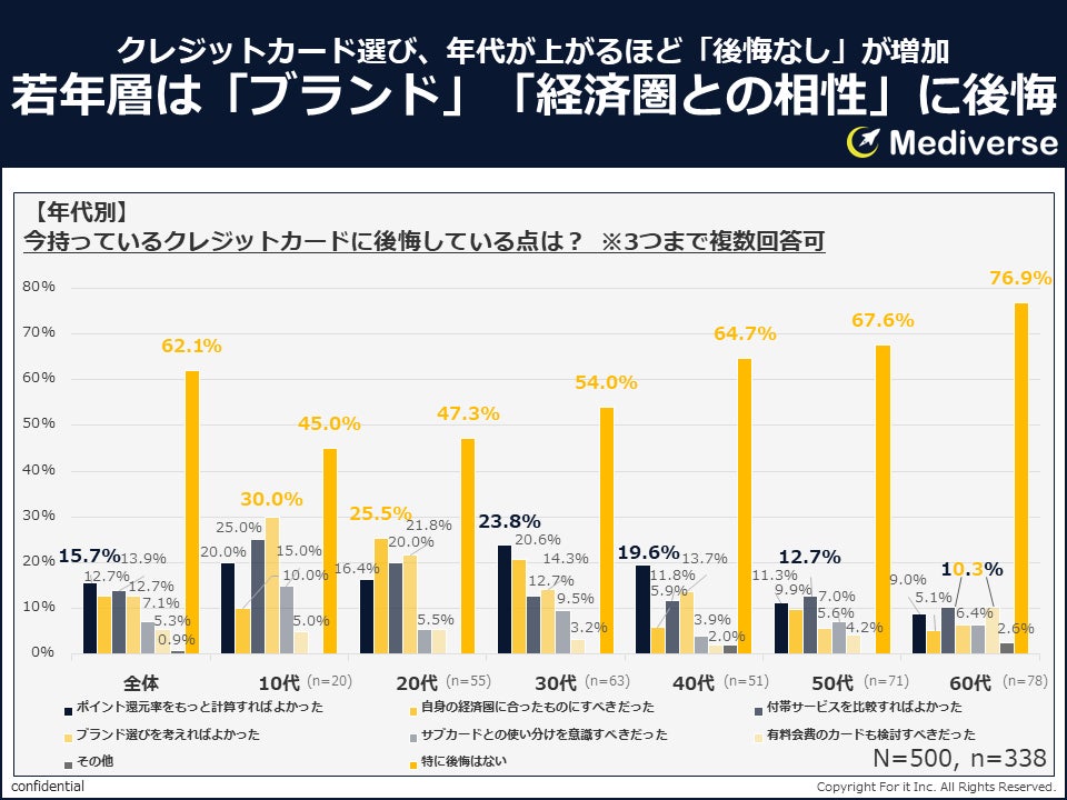 年代別では、年代が上がるほど「特に後悔はない」の割合が増加し、10代の45.0%から60代では76.9%と約8割に達しており、年齢を重ねるほど自身に合ったカード選択ができていることがわかります。10代・20代では「ブランド選びを考えればよかった」「自身の経済圏に合ったものにすべきだった」「付帯サービスを比較すればよかった」が相対的に高く、カード選択の経験不足によるミスマッチが目立ちました。30代・40代では「ポイント還元率をもっと計算すればよかった」が最多となり、家計管理を意識した視点の強まりが表れています。一方、満足度が最も高い60代においては「有料会費のカードも検討すべきだった」が最も高く(10.3%)、より上位カードへの関心の高さが確認されました。