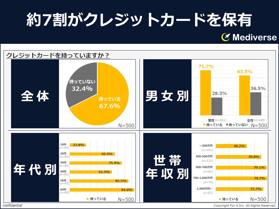 調査対象となった全国18歳以上の男女500名のうち、約7割にあたる67.6%がクレジットカードを保有していることが判明しました。男女別に見ると、男性が女性を上回り7割強の保有率となっています。年代別では50代・60代が9割前後と最も高い保有率を示しており、世帯年収別では500万円から1,000万円の層で約8割が保有している結果となりました。