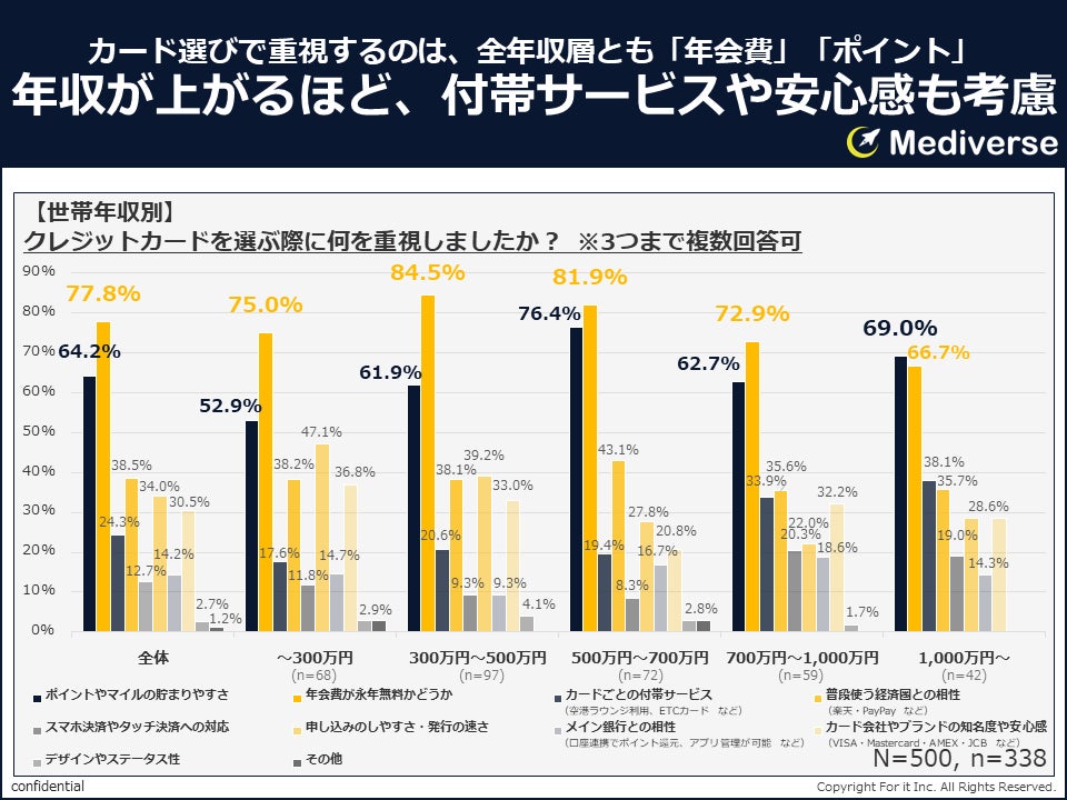 しかしながら、カードを選択した後の「現在のカードに後悔している点」では、利用経験により評価軸が変化しており、高年齢・高所得層は満足度が最も高い一方で、付帯サービスやブランド、上位カードへの関心が高まっており、機能面だけでなく質的価値も求める傾向が見受けられました。