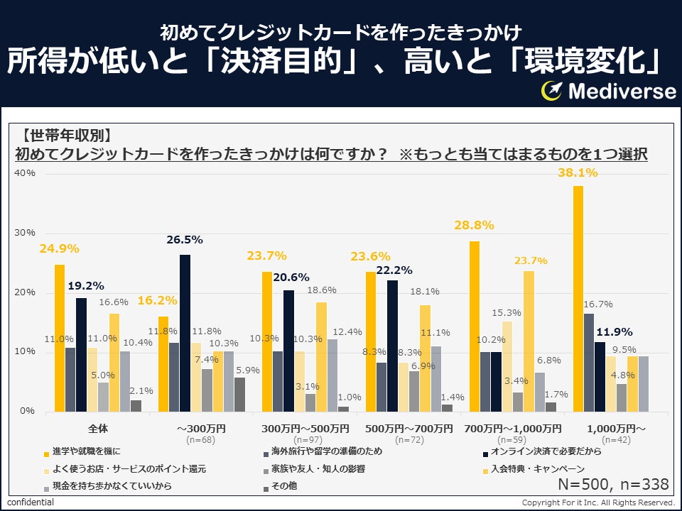 世帯年収別に見ると、年収が高い層ほど「進学や就職を機に」や「海外旅行や留学の準備のため」と回答する割合が高くなっており、環境の変化をきっかけとする傾向が見られました。一方、世帯年収300万円以下の層では「オンライン決済に必要だから」が最多となっており、実用性を重視していることがわかります。世帯年収700万円から1,000万円の層では「入会特典・キャンペーン」の割合が最も高く、お得感にも着目する堅実な姿勢が示されています。