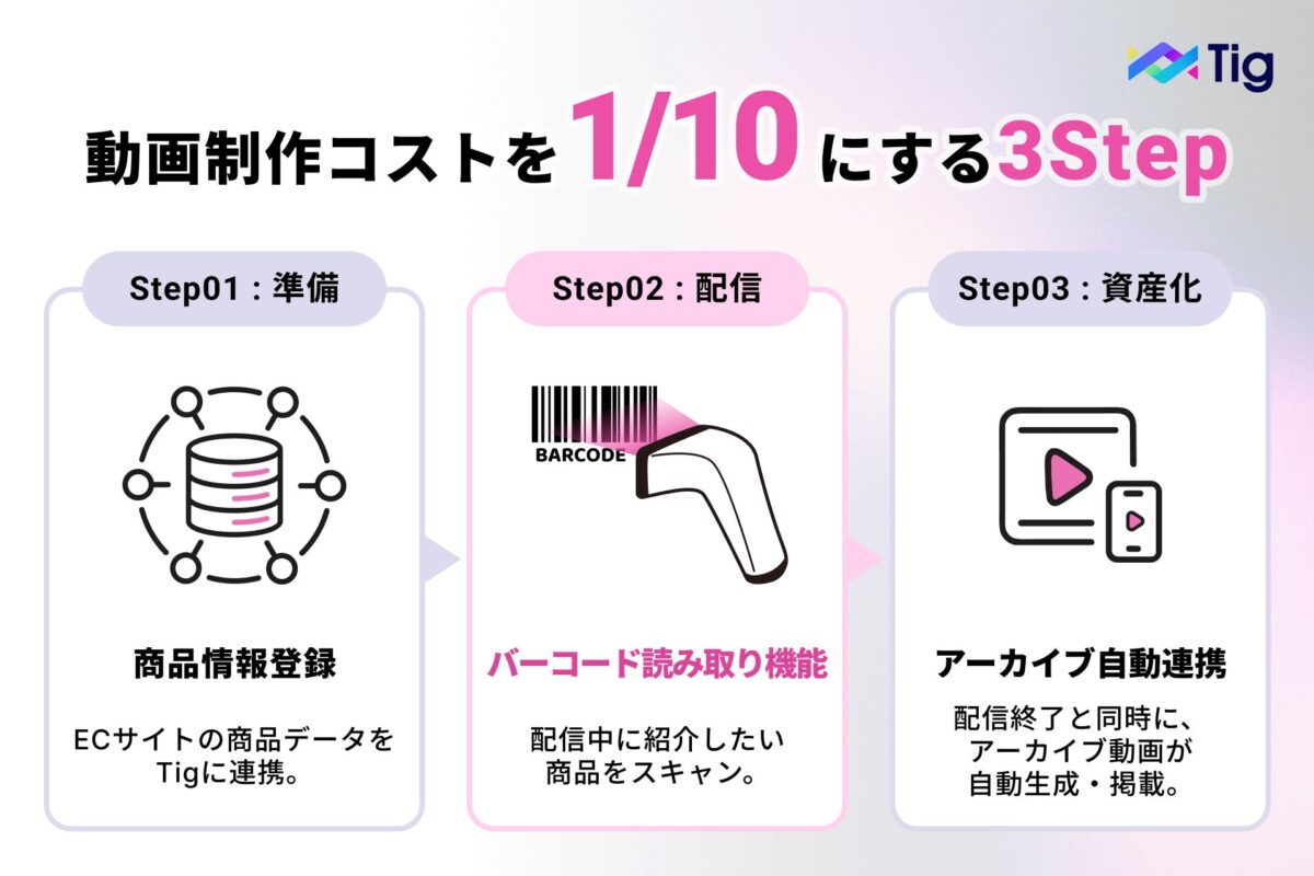 Tig LIVEの自動化ソリューションを導入することで、以下の3ステップのみで「資産型動画」の構築が完結します。