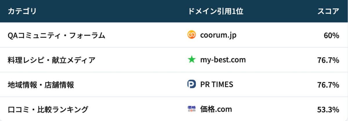 各カテゴリに合わせて設計した多数のプロンプトを4つのAIプラットフォームに投げかけ、各ドメインが引用元として一度でも表示されたプロンプトの割合をスコアとして算出されています。例えば、スコアが86.7%の場合、そのカテゴリに関する質問をAIに投げた際、約9割の確率で引用元として表示されることを意味します。