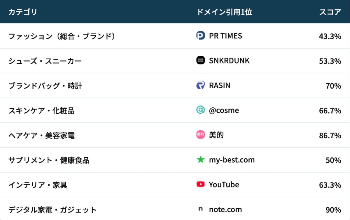 業界団体であるASPIC、動画プラットフォームのYouTube、比較メディアのmy-best.com、教育メディアのコエテコ、プレスリリース配信のPR TIMES、UGCプラットフォームのnote.comなど、AIが信頼する情報源は業界ごとに大きく異なることが判明しました。