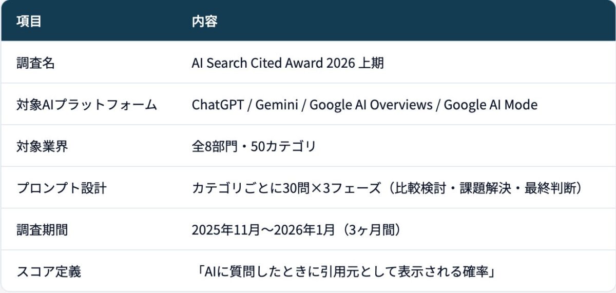このアワードは、業界およびカテゴリ別にAIが最も信頼し引用するメディアや企業をスコアリングしてランキング化し、半期に一度表彰する取り組みとなっています。Brand UPが独自に研究したAI検索時代におけるカスタマージャーニーをベースにプロンプトが設計されており、業界別の検証プロンプトを用いて主要なAI検索エンジンにおける引用状況が徹底的に分析されています。