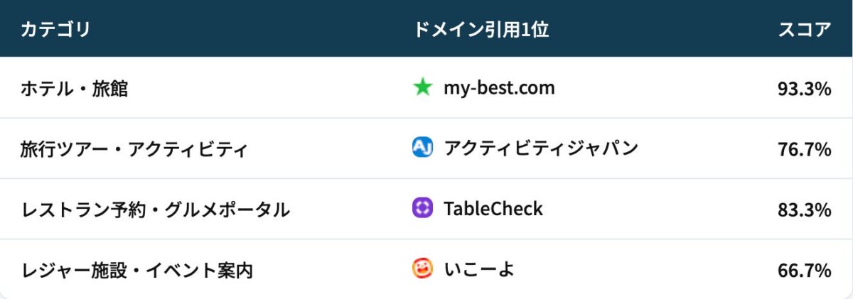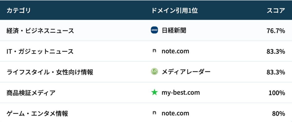 部門全体の総合スコアについては、全カテゴリのスコアを平均して算出されています。出現しないカテゴリについては0%として計算されるため、幅広いカテゴリで安定的に引用されるサイトほど、上位にランクインする仕組みとなっています。