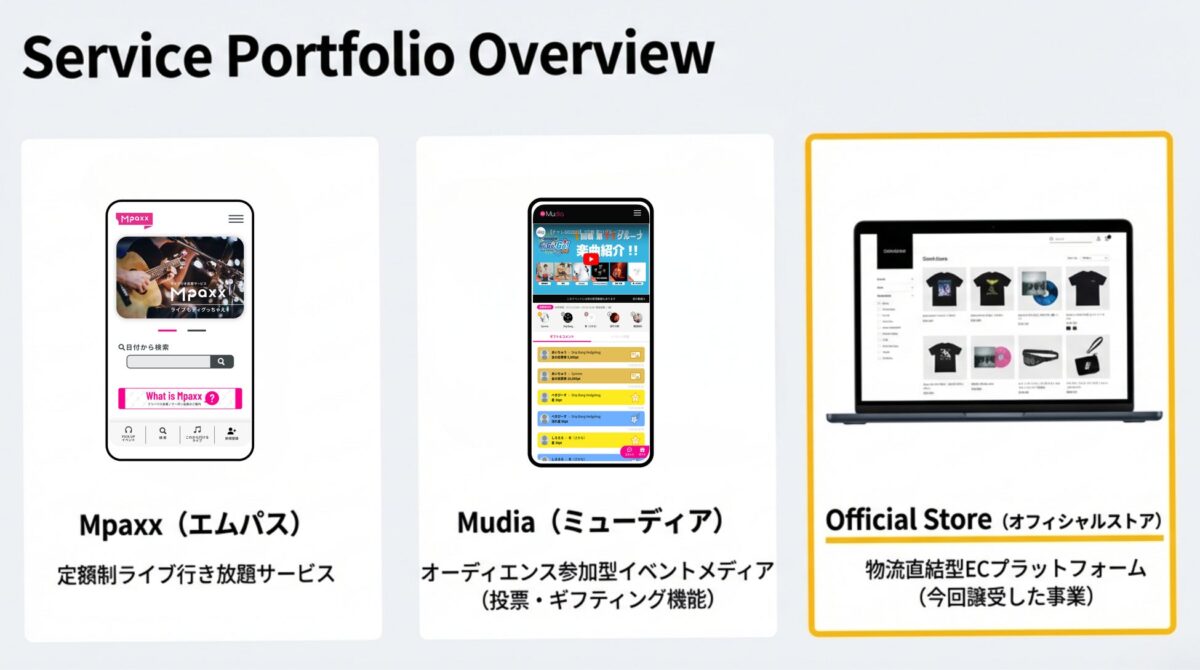 同社は、定額制でライブに通い放題のサービス「Mpaxx(エムパス)」や、オーディエンス参加型イベントメディアである「Mudia(ミューディア)」を運営する過程で構築してきた「リアルなライブを愛するファンコミュニティ」を活用します。これを今回承継するEC事業と組み合わせることで、単なるツール提供に終わらず、プラットフォーム自らがファンとの接点を能動的に創出する「成長支援型(伴走型)EC」を実現していく方針です。